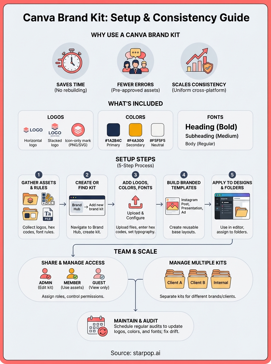 This guide walks you through exactly how to create, configure, and get the most out of your Canva Brand Kit, step by step. We'll cover everything from uploading brand assets to managing multiple kits for different clients. And if you're already producing marketing content at scale with tools like Starpop for AI-generated video and image ads, having a locked-in brand kit inside Canva means your static designs stay just as visually consistent as your AI-powered ones.