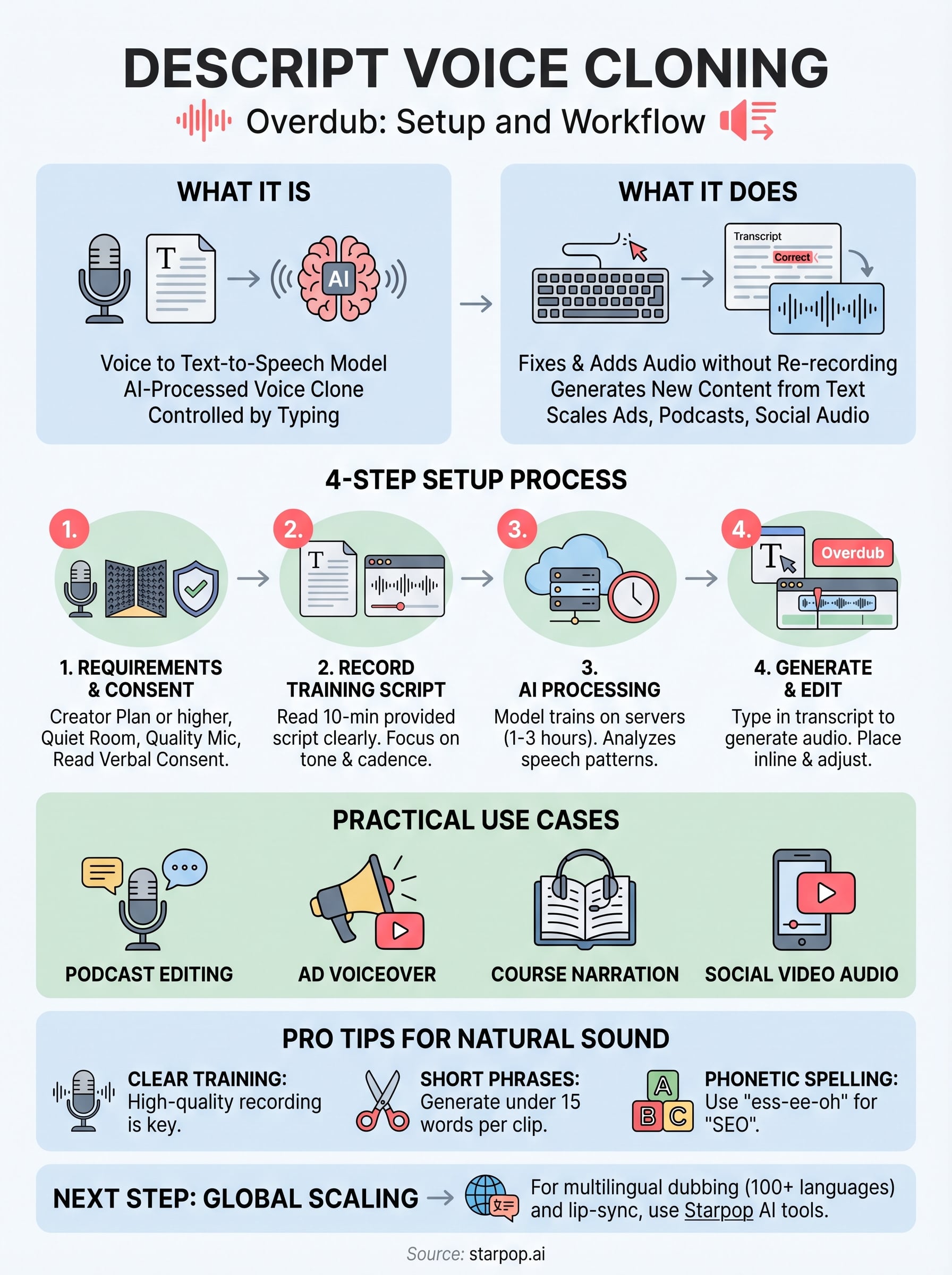 This guide covers the full Overdub setup process from account to first generated clip. And for creators who need to push voice content further, think multilingual dubbing with lip-sync across 100+ languages, Starpop extends that workflow with AI voice cloning, video generation, and localization tools built for high-volume marketing production.