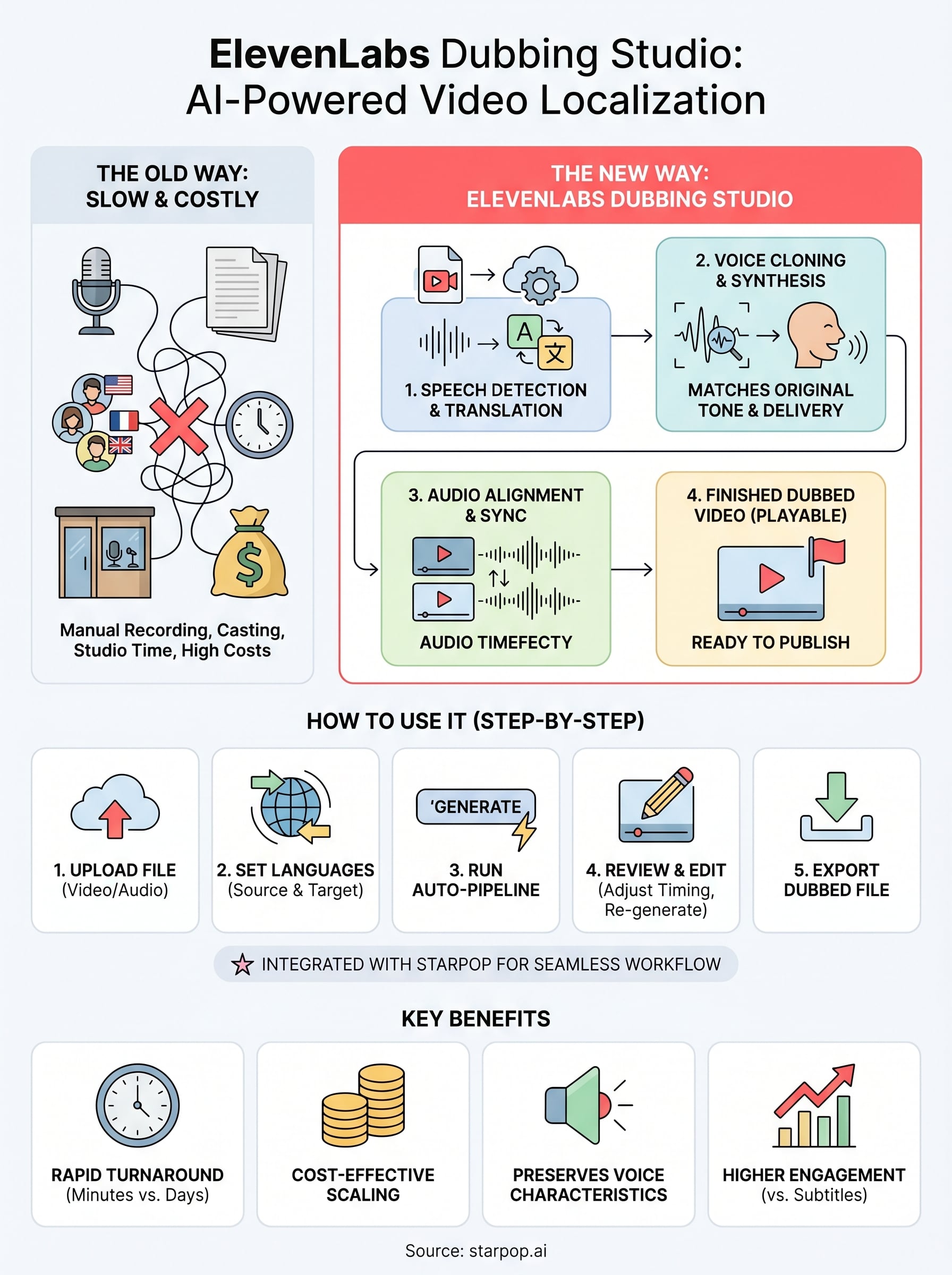 This article breaks down exactly how the ElevenLabs Dubbing Studio works, what it can (and can't) do, and how to start using it, whether standalone or as part of a broader AI content workflow.