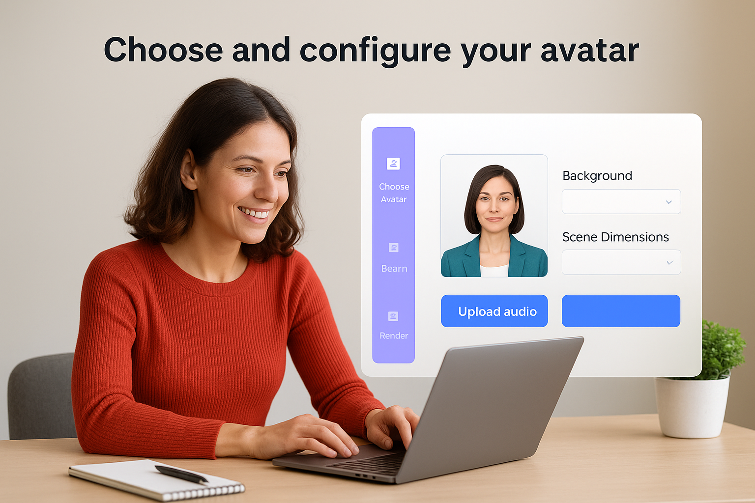 Select your avatar first, then set the background and scene dimensions before you touch the audio settings. Changing the layout after you've synced audio forces a full re-render, which wastes credits and time.