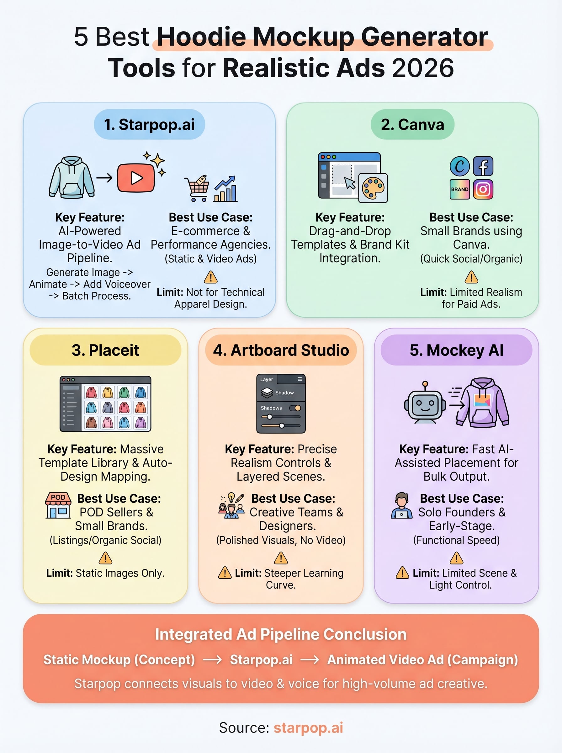 We built Starpop to help brands and agencies create hyper-realistic marketing assets with AI, from UGC-style videos to product imagery. So we know what separates a usable mockup from a scroll-stopper. Below, we've rounded up five of the best hoodie mockup generators available in 2026, comparing their strengths, limitations, and best use cases so you can pick the right fit for your workflow.