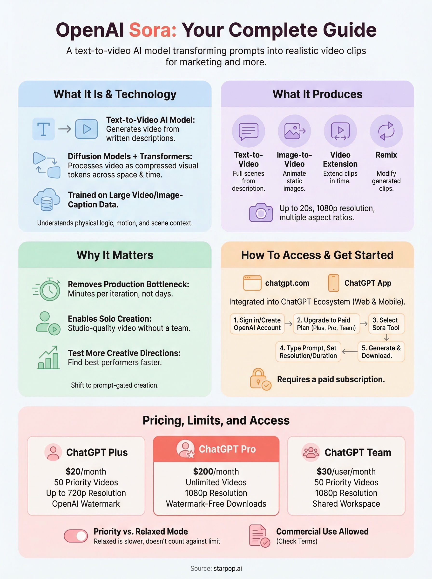 At Starpop, we give our users access to Sora alongside other frontier AI models like Google Veo, Kling, and ElevenLabs through a single platform built specifically for marketing content. So we spend a lot of time working with these tools and testing their limits. Below, you'll find everything we know about Sora, what it is, how it generates video, its current capabilities, and the exact steps to access it right now.