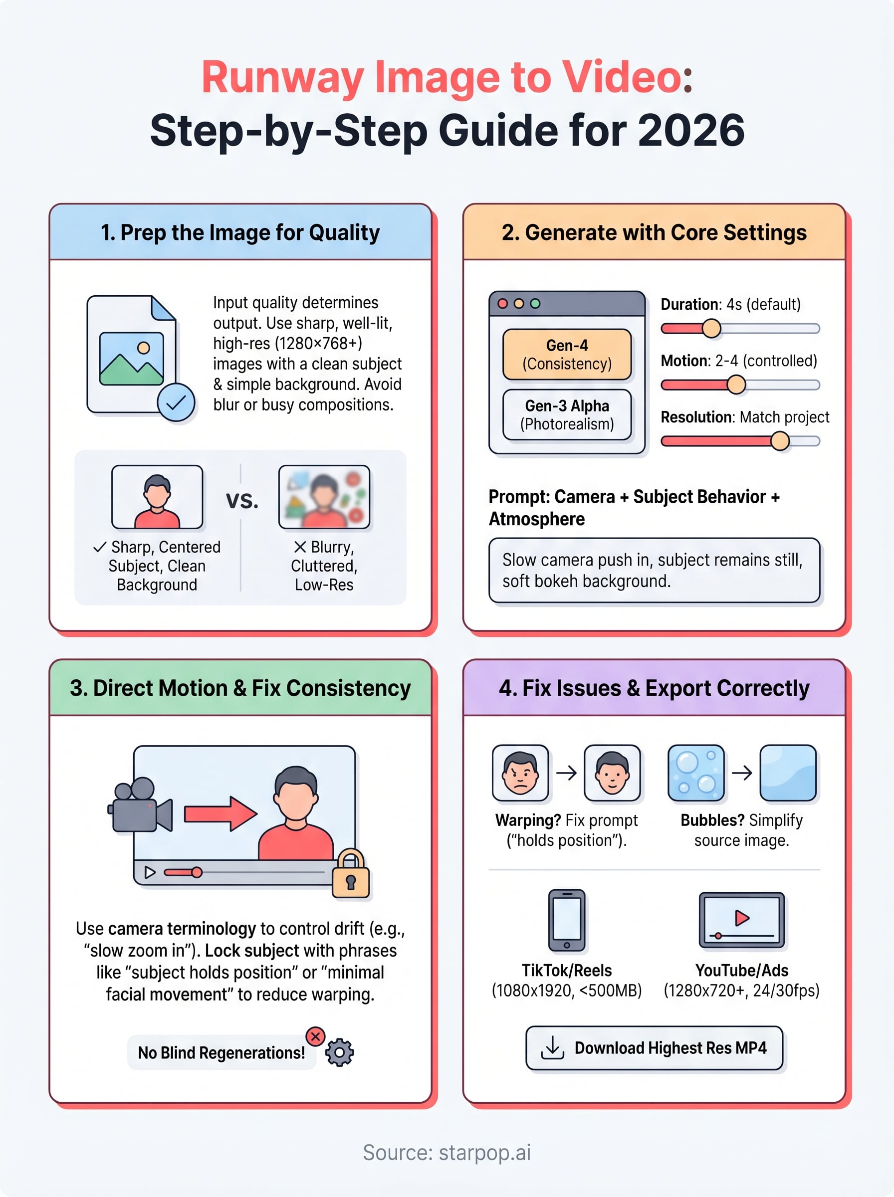 Most runway image to video problems fall into two categories: motion artifacts in the clip itself, and export settings that don't match the platform you're publishing to. Fixing both takes less time than regenerating blindly from scratch.