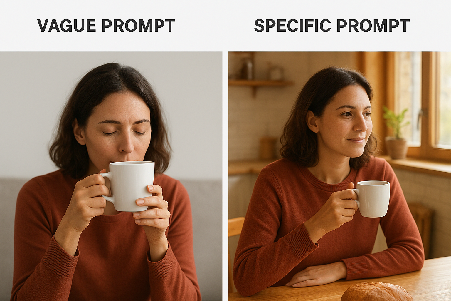 Every model, whether it generates video, images, or copy, responds to the specificity of your instructions. A prompt like "show a woman drinking coffee" can produce hundreds of different results depending on lighting, setting, mood, and style. A prompt that specifies a warm-lit kitchen, morning light through a window, candid handheld camera style, and a 30-something woman in casual clothing narrows that range dramatically. The gap between those two prompts is not a technical difference; it is a communication difference.