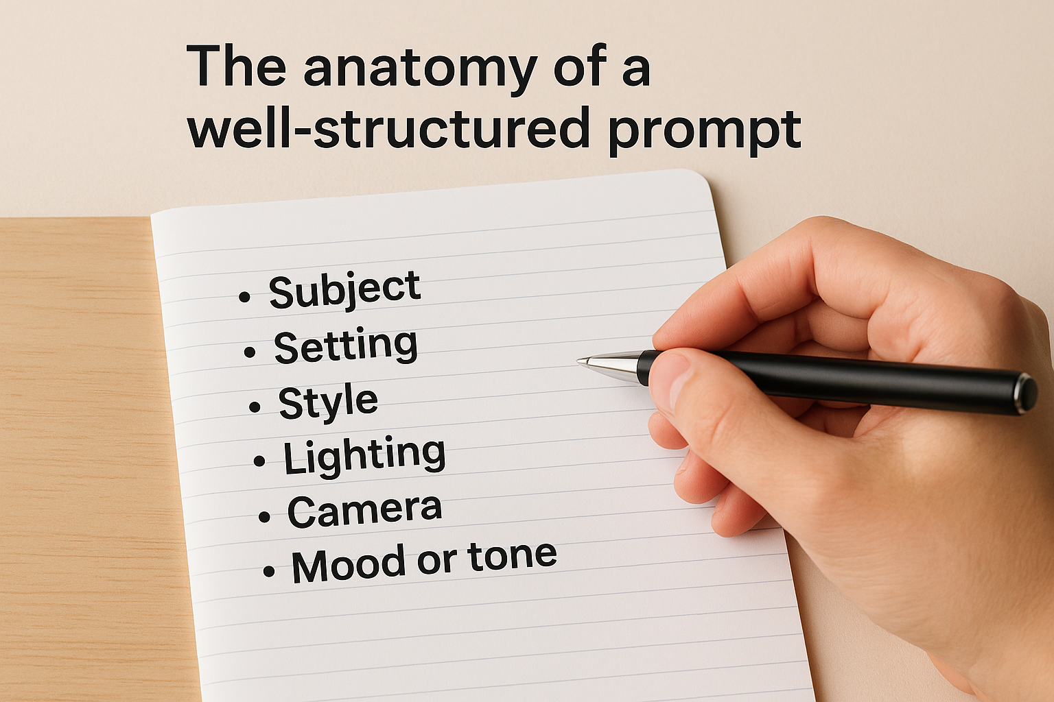 A strong prompt is not a single sentence thrown at a model. It is a layered instruction that covers the key variables a model needs to reduce guesswork. For image and video generation, those layers typically include the subject, setting, style, camera angle, lighting, and mood. For copy or voiceover scripts, they include tone, audience, format, and length. Leaving any of these blank hands the decision back to the model.