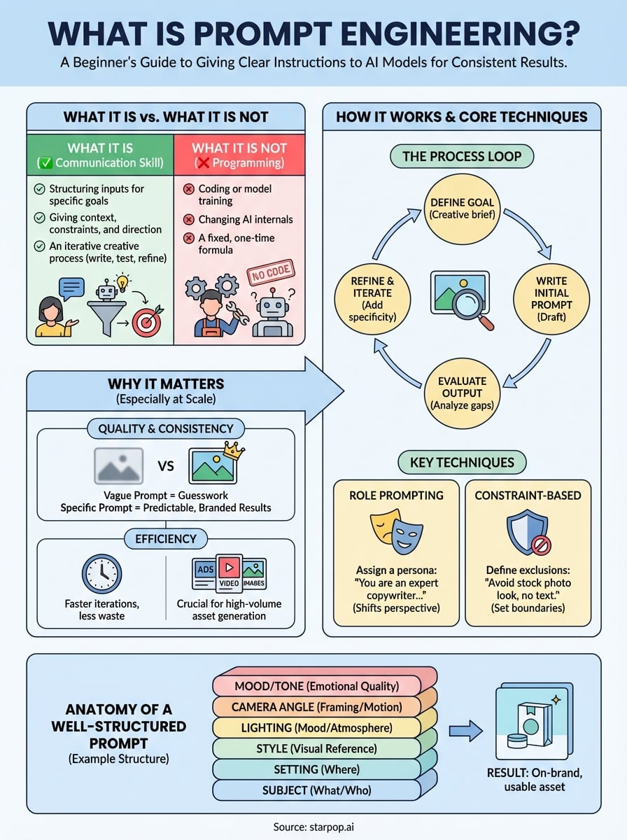 0%Every AI-generated image, video, or voiceover starts with the same thing: an instruction. The quality of that instruction determines whether the output is usable or a waste of time. What is prompt engineering? It's the skill of writing those instructions so that AI models consistently produce the results you actually need. And for anyone creating marketing content at scale, ads, UGC videos, product visuals, it's quickly becoming a non-negotiable skill to develop.