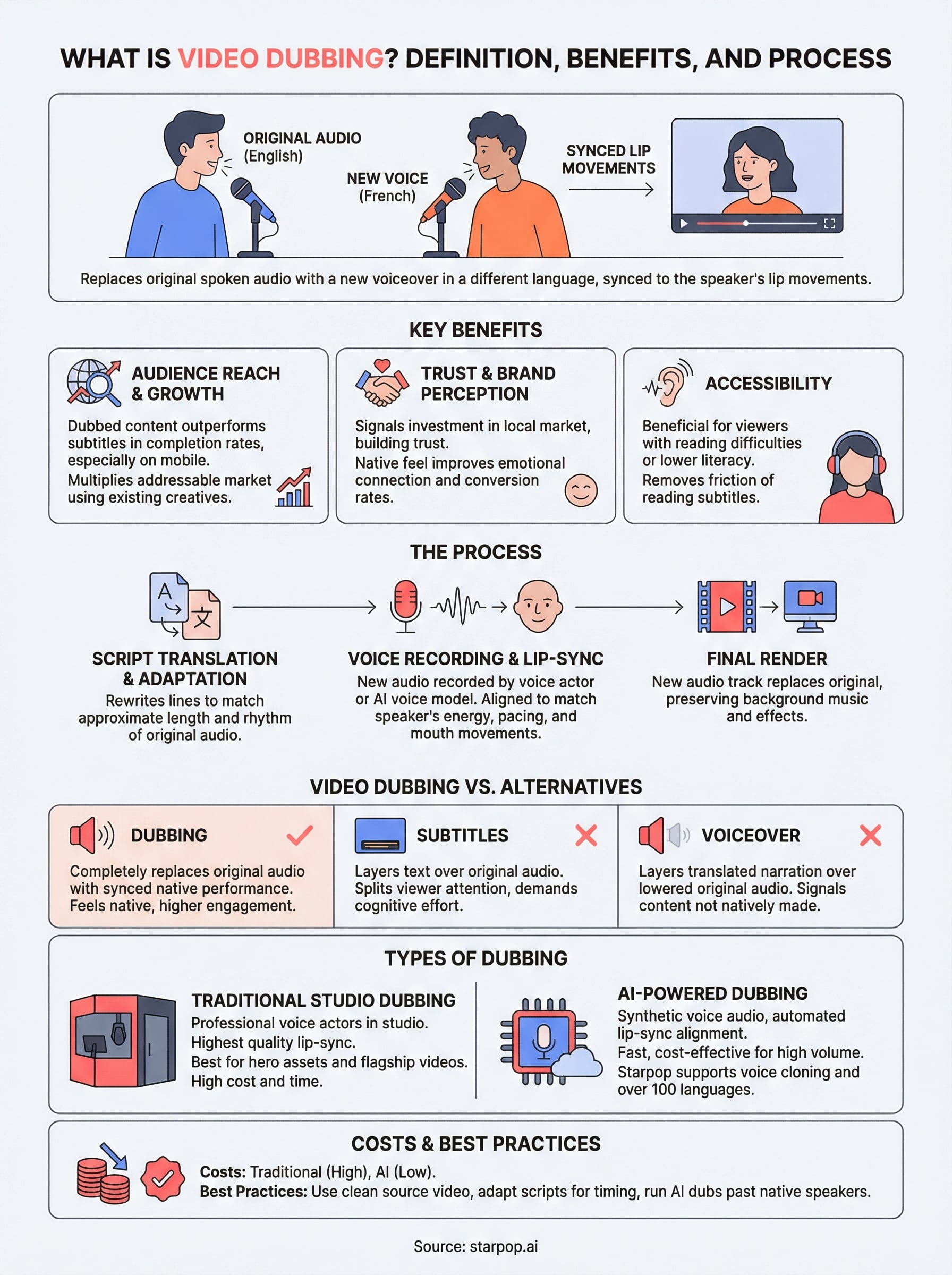This article breaks down exactly how video dubbing works, how it compares to subtitling, and where modern AI tools fit into the process. We'll also cover how platforms like Starpop, which supports voice cloning, studio-grade lip-syncing, and over 100 languages, make dubbing accessible without hiring voice actors or managing expensive localization workflows. Whether you're exploring dubbing for the first time or evaluating faster ways to localize video ads, you'll walk away with a complete picture.